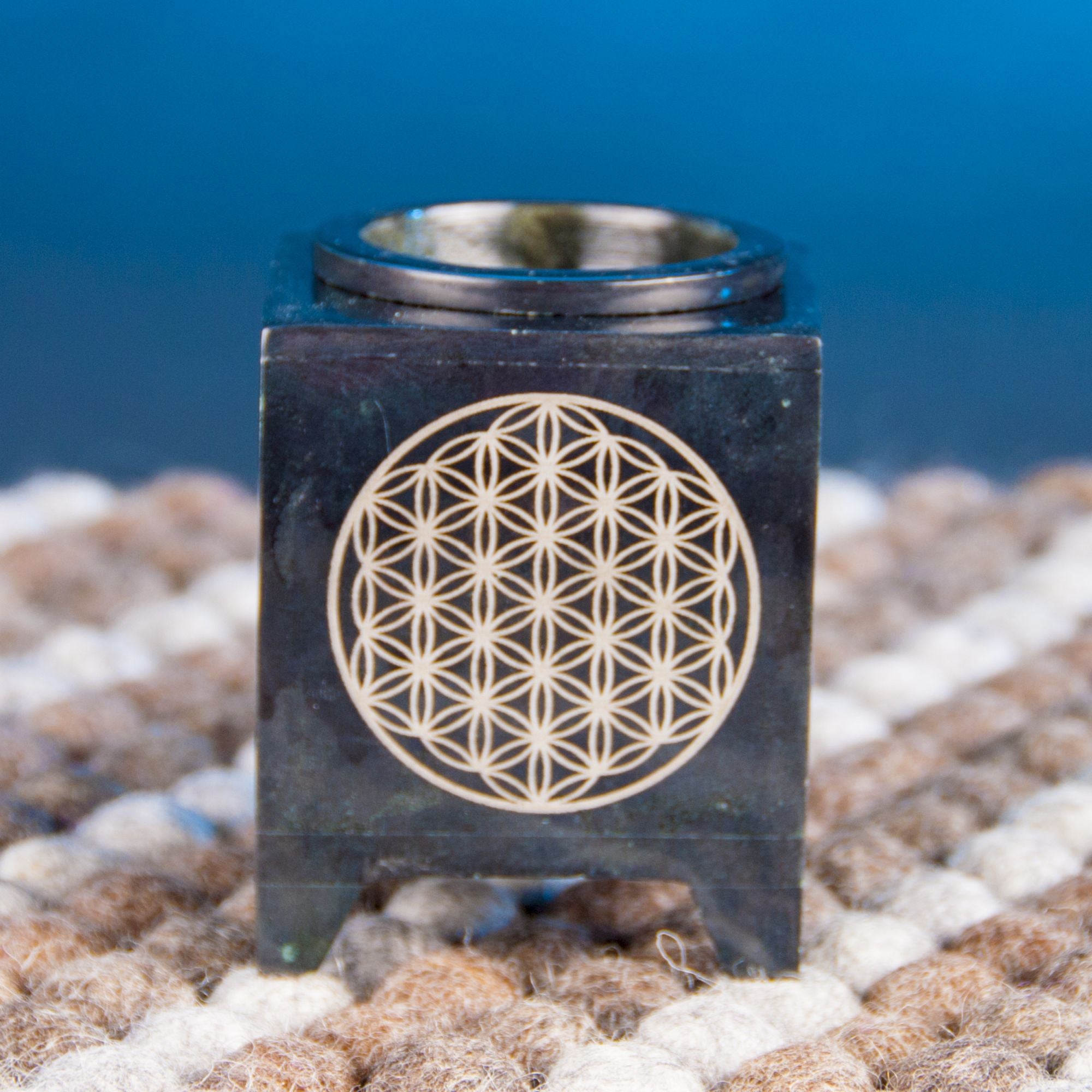 Aromalampe - Blume des Lebens Speckstein schwarz, 7,5 x 7,5 x 10 cm